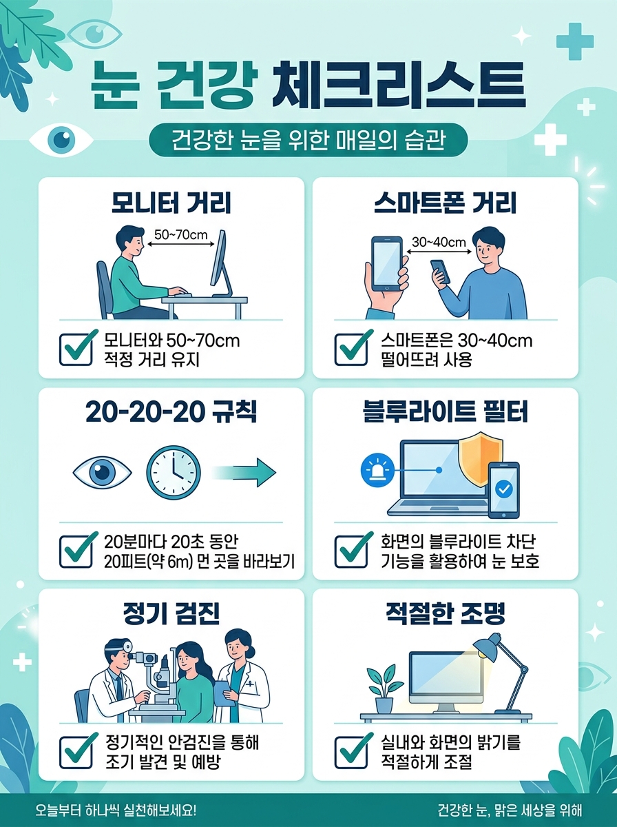 정기적 눈 검진: 최소 연 1회는 안과에서 시력 검사를 받으세요. 초기에 시력 변화를 감지할 수 있습니다.